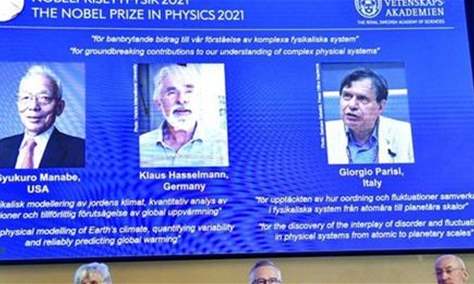 فاز ثلاثة علماء، هم الأميركي الياباني المولد سيوكورو مانابي والألماني كلاوس هاسلمان والإيطالي جورجو باريسي بجائزة نوبل للفيزياء لعام 2021 يوم الثلاثاء لإسهامهم في فهم الأنظمة الفيزيائية المعقدة مثل تغير المناخ على كوكب الأرض.