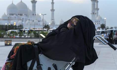 وتظهر منيرة في إحدى الصور جالسة على كرسي متحرّك خلال زيارة الجامع الكبير في أبو ظبي، حيث تقيم حالياً.