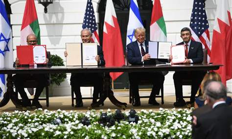 ورحب الرئيس الأميركي دونالد ترامب في كلمة له خلال توقيع اتفاق التطبيع كيان الاحتلال الصهيونيوكل من البحرين والامارات بـ”رئيس وزراء الاحتلال بنيامين نتانياهو في البيت الابيض وبوزير الخارجية الاماراتي عبدالله بن زايد ووزير الخارجية البحريني عبداللطيف الزياني”. وقال ترامب: “نجتمع هنا لتغيير مسار التاريخ ونحن نشهد فجرا جديدا للشرق الاوسط بفضل شجاعة هذه الدول”.